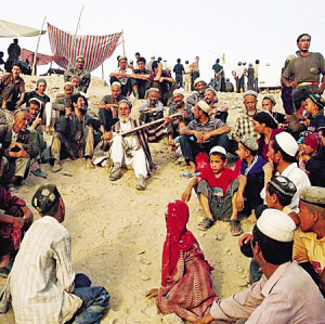 2004年6月,和田市和田縣庫(kù)克馬日暮麻扎,民間藝人在表演說唱