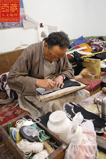 坐在工作臺上的赤列塔青,身材高大,穿一身合體的淺色藏裝,前擺上沾著幾星鼻煙,長期用針的手指有些變形。翻開他的履歷發(fā)現(xiàn),赤列塔青可以說是拉薩少有的制靴世家,他的父親邊巴頓珠在舊社會是個給人支差的貧苦鞋匠,靠給有錢人修鞋、做鞋為生。今年68歲的赤列塔青性格沉穩(wěn)、做事穩(wěn)健,他12歲當(dāng)學(xué)徒工,做鞋做了56年,如果再加上父輩的修鞋歷史,時間更長。在今天的拉薩有這樣經(jīng)歷的人算是屈指可數(shù)了。赤列塔青從小就在父親和師傅身邊打下手,逐漸掌握這個足以養(yǎng)家糊口的一技之長,終于成長為一個勤奮而多才的手工藝人,開始了穩(wěn)坐一隅的匠人生涯。