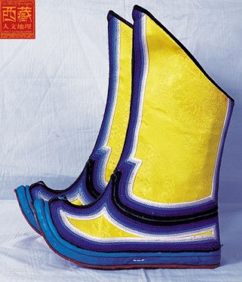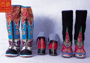 西藏高原地域遼闊,每個地區(qū)都有屬于自己的鞋子。藏族男女鞋,外觀雖然很像舞臺上古裝戲里穿的靴子,但用牛皮做底,底高二寸,腰高至小腿之上,鞋面用紅綠相間的毛呢裝飾,鞋腰也有線條、花紋,鞋幫用各色絲線或各色皮革、氆氌、金絲緞制成。人們能從一個人所穿的鞋子判斷出一個人的職業(yè)和社會階層。