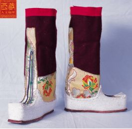 一般藏族男女通行的長筒靴,底高2厘米,腰高至小腿之上,用鞋帶系幫。從大的方面講,藏鞋可分為四種,即“松巴拉姆”、“嘎洛”鞋、靴子和“嘉慶”等,還有單層底、多層底等不同的鞋種,用氌氆、毛呢、皮革、氈子、綢緞、麻布等做料子?!八砂屠贰庇址Q松巴鞋,根據(jù)不同的地區(qū),松巴鞋還可分為藏松巴、江孜松巴、拉薩松巴等, 以花紋秀麗繁雜著稱。嘎洛鞋的特點是美觀、結(jié)實,分為兩種:工布地區(qū)的嘎洛,鞋腰多為牛皮底,上面勾出狗鼻紋;在墨竹工卡、彭波等地流行的嘎洛鞋則一般不用皮料作底,鞋面圖案大方、素雅。靴子大致也有三種:用黑色平絨布和牛皮相間作腰的稱為“熱瑪魯”;用絨布作筒的稱作“布江”;鞋腰全部用皮料的叫做“過瓦靴子”。靴子的顏色以黑色居多,具有典型的蒙古風格。而“嘉慶”是藏鞋中的高檔品,藏語里是“虹影”的意思,鞋面及鞋腰上的兩組線條恰似美麗的彩虹,底子很厚,用優(yōu)質(zhì)毛氈疊加,保暖結(jié)實。目前售價在七百元以上的“嘉慶”鞋多為過去上層官員專用。