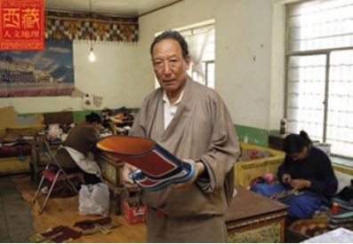 坐在工作臺上的赤列塔青,身材高大,穿一身合體的淺色藏裝,前擺上沾著幾星鼻煙,長期用針的手指有些變形。翻開他的履歷發(fā)現(xiàn),赤列塔青可以說是拉薩少有的制靴世家,他的父親邊巴頓珠在舊社會是個給人支差的貧苦鞋匠,靠給有錢人修鞋、做鞋為生。今年68歲的赤列塔青性格沉穩(wěn)、做事穩(wěn)健,他12歲當學徒工,做鞋做了56年,如果再加上父輩的修鞋歷史,時間更長。在今天的拉薩有這樣經(jīng)歷的人算是屈指可數(shù)了。赤列塔青從小就在父親和師傅身邊打下手,逐漸掌握這個足以養(yǎng)家糊口的一技之長,終于成長為一個勤奮而多才的手工藝人,開始了穩(wěn)坐一隅的匠人生涯。
