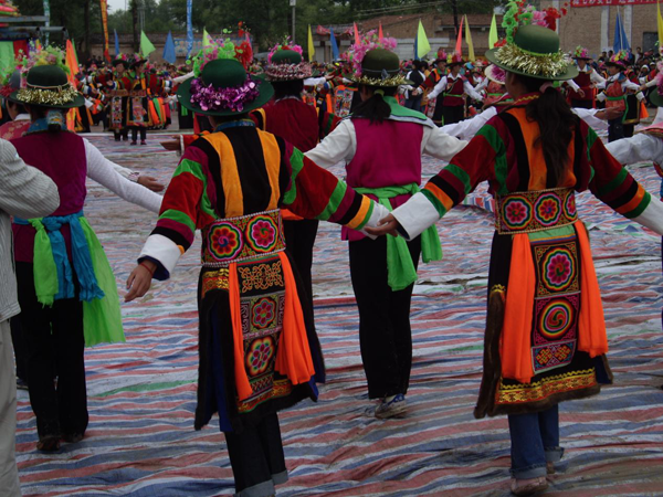 不同地區(qū)的土族舞蹈具有相對獨(dú)立性,互助的“安昭”、民和的“納頓”、大通的“踏灰”、同仁的“於菟”、甘肅卓尼的“嘎爾”等是最具代表的民間舞蹈?!鞍舱选保琳Z稱之為“千佼日”,意為“彎曲”或“轉(zhuǎn)圈”,是土族民間喜慶節(jié)日和婚禮儀式中,用于禮贊祈祝的一種圓場群舞,也是一種歌舞結(jié)合、無樂器伴奏的集體舞蹈。一般由男女各半圍成圓圈,由一男子帶領(lǐng),一唱眾和。舞蹈動作簡單質(zhì)樸,舞者兩手由右胯旁起向左上方至右上方劃圓弧,變?yōu)樽笫智谀X前,右手高居于后,似雄鷹翱翔于藍(lán)天。“於菟”舞即虎舞。“於菟”,是古代楚人對虎的方言稱謂。每年農(nóng)歷十一月二十日祭山神時,名為於菟的舞者在赤裸的上身繪制虎豹圖案,模仿虎的形象“前端腿跳”舞蹈,達(dá)到祀神驅(qū)邪、祈求平安的目的。