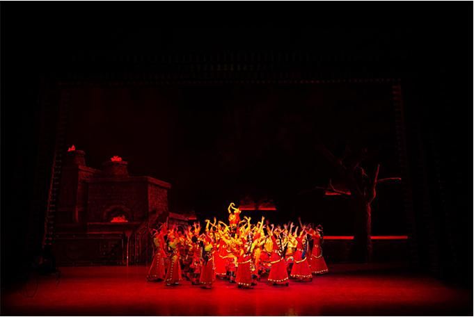 在手段創(chuàng)新上,主創(chuàng)人員在嚴(yán)格遵循南木特藏戲藝術(shù)傳統(tǒng)和戲劇原則的基礎(chǔ)上,設(shè)計(jì)了部分新的唱腔,使用了現(xiàn)代舞臺(tái)的舞美和聲光電手段,采用了26人組成的中型民族樂(lè)隊(duì),從而營(yíng)造出了全新的舞臺(tái)效果。在藝術(shù)手法上,還采用了以南木特藏戲手段表現(xiàn)西藏藏戲內(nèi)容的特殊表現(xiàn)形式,以戲中戲的重疊盡顯不同風(fēng)格的藏戲風(fēng)采,大大地豐富了表演手段和出彩看點(diǎn),為觀(guān)眾提供了巨大的想象空間。