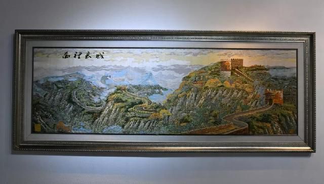 《萬里長城》是金文集數(shù)年之功完成的云錦巨制。觀者立于高山之巔,長城從峰巒疊嶂間伸向遠(yuǎn)方,更有一旁朝霞相伴,使畫面錯(cuò)落有致,層次豐富。