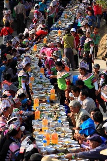 節(jié)日期間,哈尼寨子擺起長(zhǎng)街宴,哈尼語(yǔ)叫“姿八多”,意為“互相輪流著敬酒”。小寨子擺一次,吃一天,大寨子則要擺兩三次,吃兩三天。每戶做一桌酒菜,抬到寨子街道上擺好,一戶接一戶沿著街道擺成長(zhǎng)街宴,八個(gè)或十個(gè)人自愿結(jié)合為一桌暢飲。大寨子分片輪流做東,負(fù)責(zé)長(zhǎng)街宴的酒菜,其他片的人做食客,從早吃到晚,場(chǎng)面十分熱鬧。