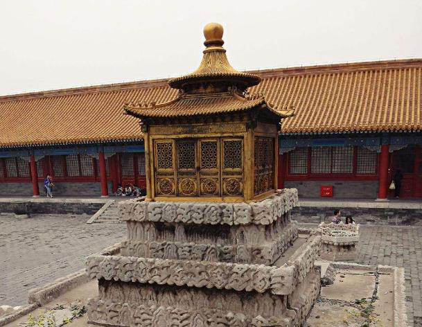 大高玄殿乾坤亭,始建于明嘉靖二十一年(1542年),名無上閣,清代乾隆朝改名乾元閣。明代時供奉嘉靖皇帝玄修像(稱象一帝君)。此亭為木構(gòu)建筑,上層為圓攢尖寶頂,下層為方形,上下層之間有一層圓形平座層。