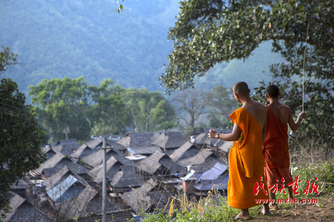 扶貧攻堅決定張家老寨全部拆除重建,兩位僧人注視著即將消亡的老寨(攝于2015年1月,布朗山張家老寨)