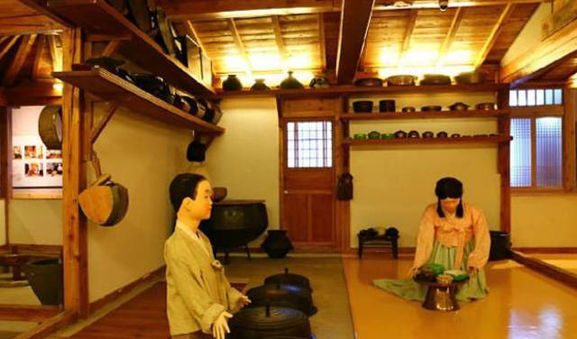 無論什么類型的朝鮮族傳統(tǒng)民居,只要走進房屋,第一個感覺就是有很大的一個炕??皇浅r族人在室內(nèi)的主要活動空間,你看有的炕上親友們在圍桌對飲,有的炕上婦女們在做活計,還有的炕上孩子們在玩耍??淮螅崦娣e就大,屋里到了冬天就會顯得特別暖和。在延邊地區(qū)朝鮮族房屋內(nèi)的灶坑更是別具一格,它下陷在地下,底部低于地面,上部還有蓋板,而蓋板和鍋臺、炕面形成了一個平面。據(jù)說,這種灶坑是既好燒、又衛(wèi)生。