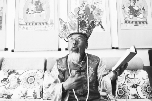 “東巴,在納西語里意為活佛或智者?!痹谟颀埣{西族自治縣圖書館,李瑞山一邊講解,一邊向筆者展示館藏文物,這其中包括占卜紙牌畫、祭祀法杖和東巴經(jīng)等。引起筆者注意的是一幅形似唐卡的卷軸畫,畫中的主人公竟是藏族詩人倉(cāng)央嘉措。“用東巴文所寫的《卓伯所》一書里,記載了納西族與藏族、白族先民之間同宗共祖的兄弟關(guān)系,這點(diǎn)與木氏宗譜碑上所刻是一致的。所以,我們有關(guān)于藏族的記載并不奇怪,民族交融自古就有。”