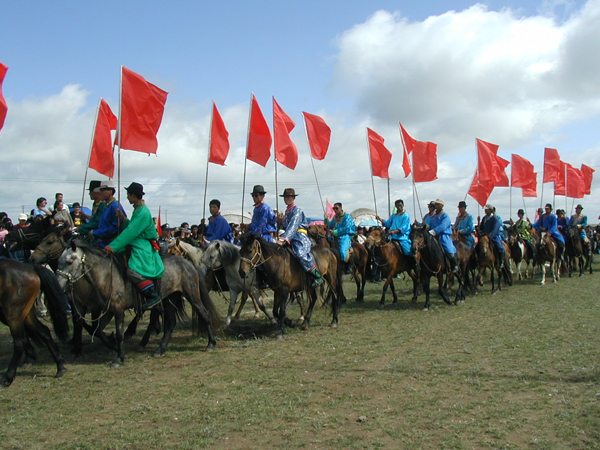蒙古民族幾乎人人都天生酷愛(ài)馬,也很會(huì)訓(xùn)練馬,若在過(guò)去,作為馬背民族更是離不開(kāi)馬。好馬、好騎手一直享有極高的榮譽(yù)。因此,賽馬當(dāng)然成為牧民最喜愛(ài)的運(yùn)動(dòng)。蒙古族賽馬一般分賽走馬和賽奔馬兩種。賽走馬是指讓鞍具齊全并釘有合適馬掌的馬跑對(duì)側(cè)步(即前后蹄一順交錯(cuò)前進(jìn)),比馬的速度、耐力、穩(wěn)健和美觀。有豐富經(jīng)驗(yàn)者才能騎出走馬來(lái),所以,參賽的馬多用5歲以上的成年馬,騎手也以成年人為主。比賽時(shí),要求騎手有高超的騎術(shù),能夠駕馭好馬,使其既走得快、穩(wěn)、美,又不能跑起來(lái)。還要求馬抬步越高越好,這樣顯得很有“風(fēng)度”,這不僅取決于馬掌的重量,還要看馬的素質(zhì)。一匹好的走馬,即便在牧區(qū)也價(jià)格非常昂貴。賽奔馬是比馬的速度和耐力,以先到達(dá)終點(diǎn)者為勝。奔馬的步伐與走馬不同,是四蹄分前后成雙交錯(cuò)奔跑。參賽的選手多為十二三歲的小男孩,因?yàn)樗麄凅w輕敏捷。為了減輕馬的負(fù)荷和照顧騎手的安全,奔馬都不備鞍具或配備輕巧的鞍具。騎手們只穿華麗的彩衣,頭束紅綠飄帶,顯得英武、神氣。賽程一般長(zhǎng)25至35千米。奔馬賽比走馬賽普遍,參賽的人數(shù)也多,少則幾十,多則逾百。比賽開(kāi)始,選手們迅速躍馬,揚(yáng)鞭飛奔,觀眾則雀躍歡呼,吶喊助威【圖為馬隊(duì)進(jìn)場(chǎng)儀式,劉軍攝影】。