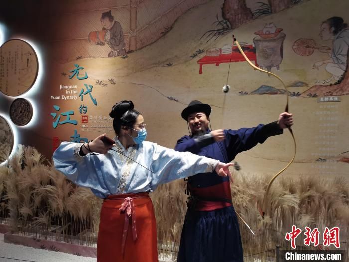 工作人員穿著元代人的裝束現(xiàn)場“彎弓射大雕”?!$娚z