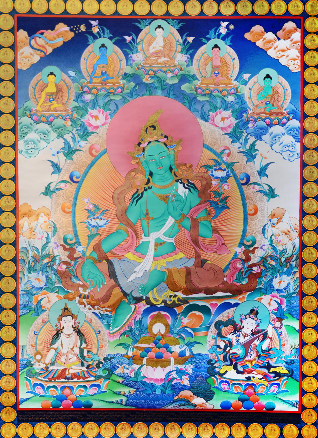 綠度母為觀世音菩薩的化身。度母,梵名Tara,全稱圣救度佛母,我國古代稱多羅菩薩、多羅觀音,度母有許多不同的化現(xiàn),包括有二十一度母、五百度母等等,皆為觀世音菩薩之化身,而綠度母為所有度母之主尊,總攝其余二十尊化身之所有功德。