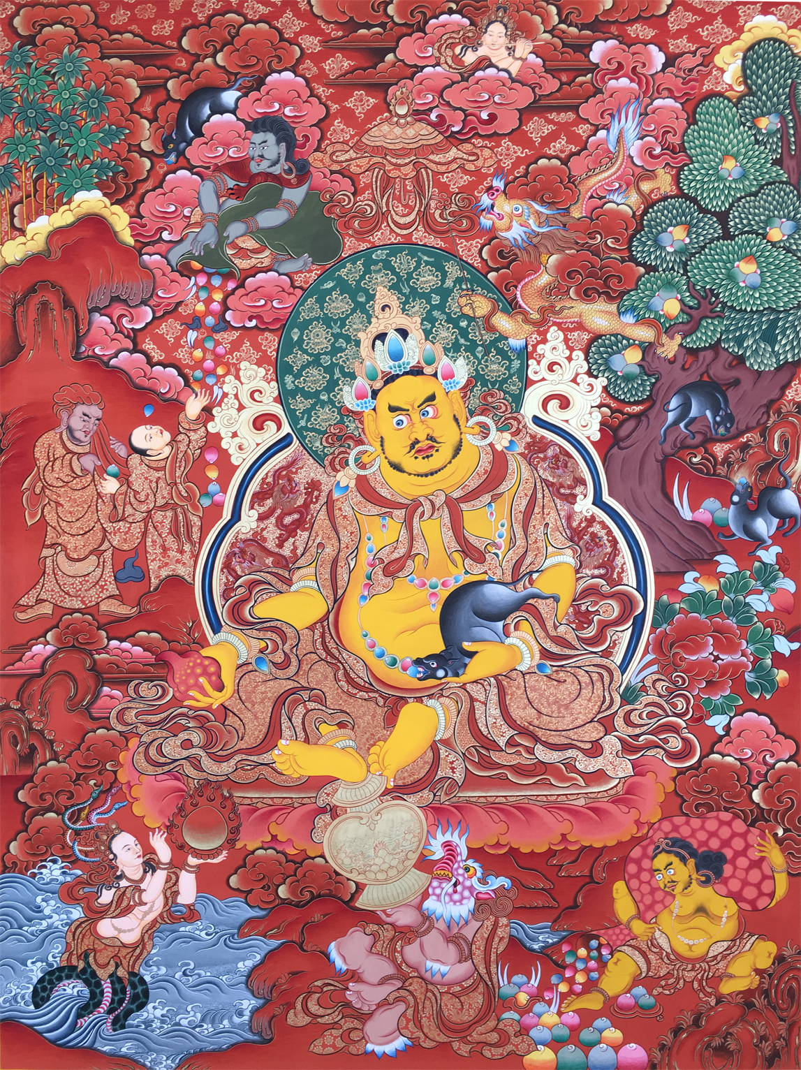 黃財神即黃布綠金剛,藏名為:“藏巴拉 些玻”。財源廣黃財神為五姓財神之一,主司財富,能使一切眾生脫于貧困,財源廣進。當(dāng)初釋迦牟尼佛于靈鷲山宣傳說大般若經(jīng)時,諸魔鬼神等皆前來障礙,令高山崩塌,大眾驚恐,此時黃財神就現(xiàn)身庇護,后來世尊囑咐黃財神,當(dāng)于未來世助益一切貧困眾生,為大護法。