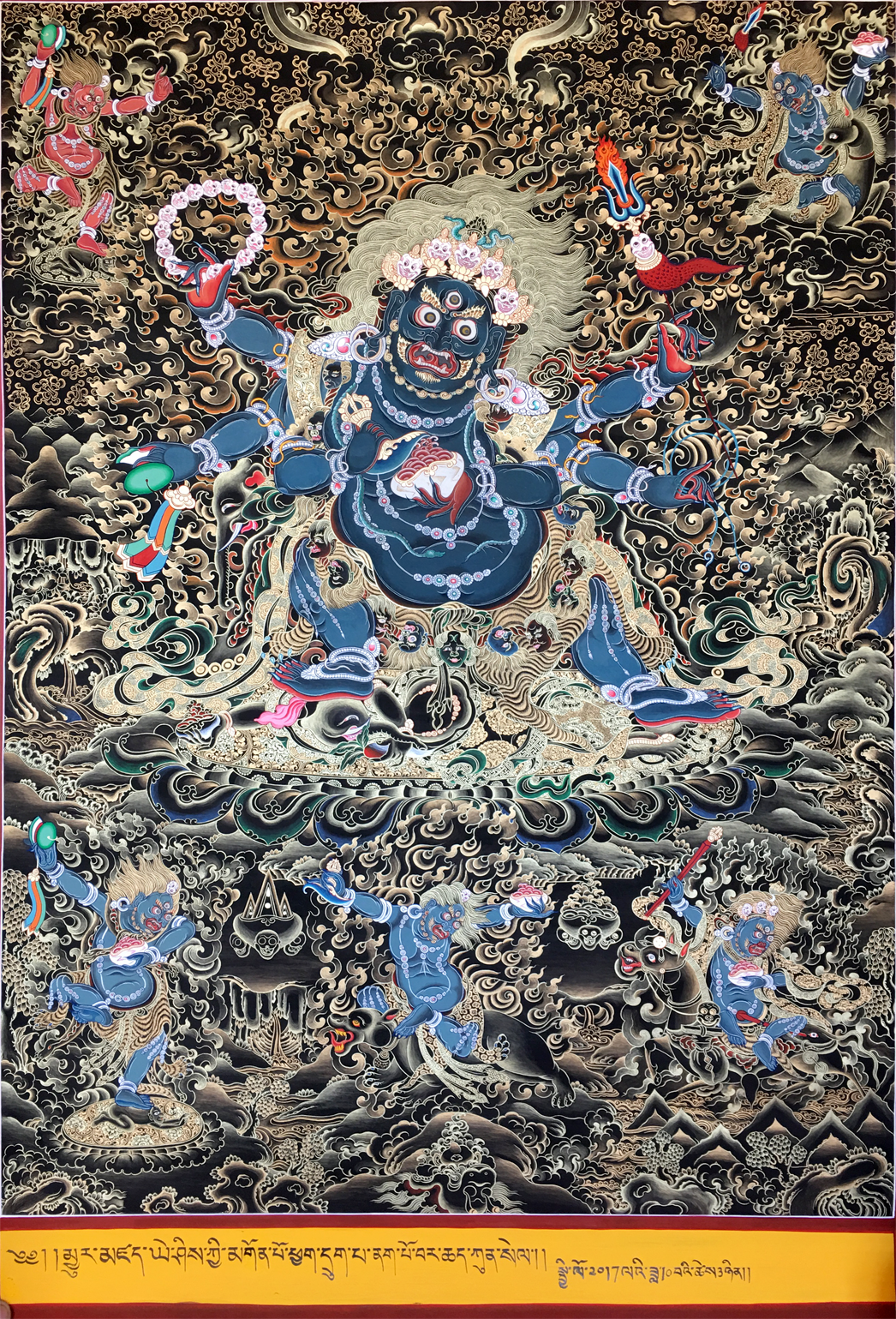 六臂瑪哈嘎拉(梵語(yǔ):Mahakala,藏語(yǔ):Gonpo)又意譯為大黑、大時(shí)、大黑神或大黑天神等,或者直接音譯為摩訶迦羅(佛經(jīng)中經(jīng)常出現(xiàn)的名字)、莫訶哥羅、瑪哈嘎拉等名稱(chēng)。該神本是婆羅門(mén)教濕婆(梵語(yǔ):Shiva,梵語(yǔ)又名:Mahesvara,即大自在天)的變身,后為佛教吸收而成為佛教的護(hù)法,特別是在密宗中大黑天是重要的護(hù)法神。藏傳佛教認(rèn)為大黑天是毗盧遮那佛(梵語(yǔ):Vairocana,藏語(yǔ):nam par nang zhe,或稱(chēng)為大日如來(lái))降魔時(shí)呈現(xiàn)出的忿怒相。