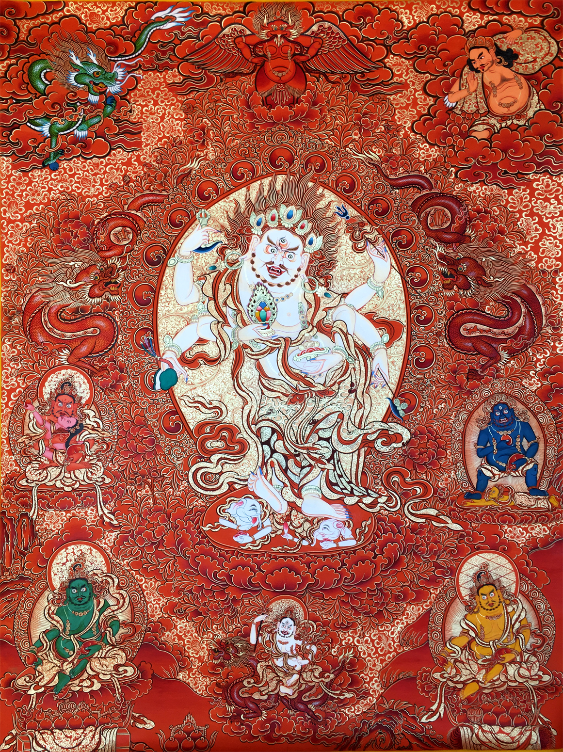 六臂白瑪哈嘎拉正名為白如意珍寶依怙主 。首宏於香巴噶舉,后另傳至薩迦派分支,為特別不共法門,是求財(cái)?shù)闹腔圩o(hù)法,相傳此尊住於印度清涼尸陀林。此尊身白色,一面六臂三目,須眉毛發(fā)金黃,獠牙外露卷舌相。頭戴寶冠,珍寶瓔珞,天衣彩裙為身莊嚴(yán),身材短胖,并有小鈴華蔓為飾。兩腳作巡行狀,踏於持寶鼠之白象王財(cái)神之背。