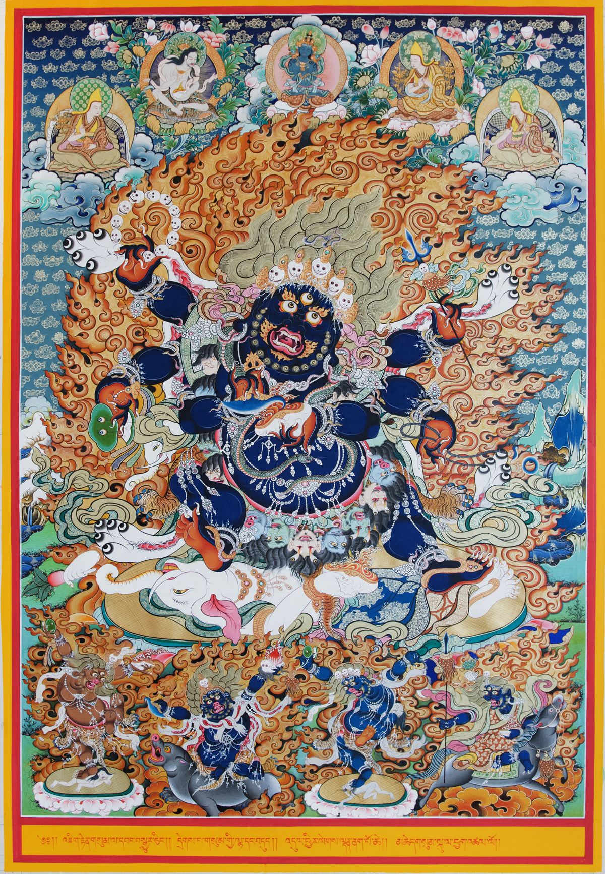 “貢布”護(hù)法神全身青黑,威武神勇,腳踝佩戴著腳鏈以作裝飾,腳下踩著象頭魔,這象頭魔梵語(yǔ)叫毗那耶迦(Vinayaka),后來(lái)成為佛教一位財(cái)神護(hù)法。他手里拿著一根白蘿卜,仰臥在蓮花日輪之上,這白蘿卜象征財(cái)富。“貢布”的腰間系著虎皮裙。共有六條手臂,在每條手臂上,都有蛇圍繞,猶如臂環(huán)手鐲一般。右邊三手從上到下分別持彎刀、骷髏念珠和手鼓,左邊三手從上到下依次持盛血顱器、三叉杖和伏魔索。左右最上兩手右彎刀、左顱器置于胸前。