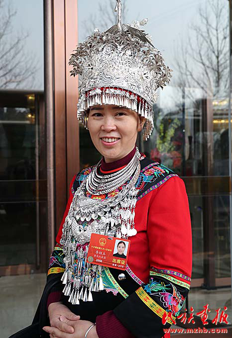 “頭頂高高的銀飾,脖子上一圈圈精美的項圈,走起路來叮當(dāng)作響,來自重慶市彭水苗族土家族自治縣的全國人大代表李紹玉(苗族)的這一身穿戴,一出現(xiàn)就很抓人眼球。再細看,這一身大紅的苗族傳統(tǒng)衣裝上,胸前、袖口還有繁復(fù)精致的刺繡。