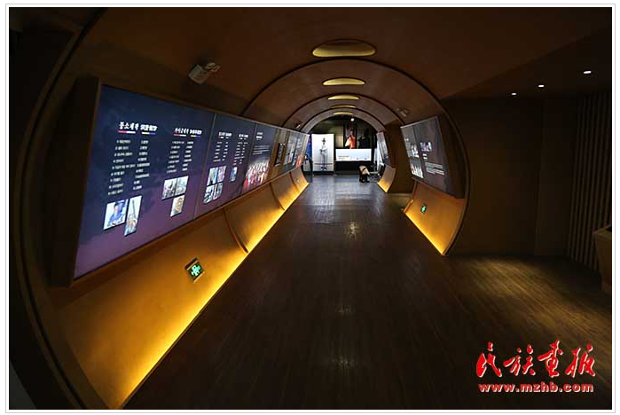 一樓展廳主題為“舞樂(lè)風(fēng)情”,展廳墻體為一道曲線(xiàn),別致新穎,據(jù)了解,展示舞蹈的曲線(xiàn)墻設(shè)計(jì)靈感來(lái)自朝鮮族象帽舞?!跋竺蔽琛笔寝r(nóng)樂(lè)舞拓展項(xiàng)目,國(guó)家級(jí)非物質(zhì)文化遺產(chǎn),是朝鮮族“農(nóng)樂(lè)舞”中表演難度和藝術(shù)價(jià)值最高的表演形式。參觀(guān)者走進(jìn)互動(dòng)體驗(yàn)區(qū),可以戴上象帽體驗(yàn)飄帶飛舞的熱烈奔放感?!跋竺蔽琛钡娘h帶不斷向上盤(pán)旋,代表著朝鮮民族對(duì)未來(lái)生活的祝福。
