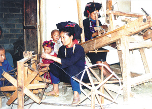 紡紗、織布、藍(lán)染,是哈尼族婦女制作服裝的重要組成部分。她們?cè)诳棽记耙龅臏?zhǔn)備工作,就是操動(dòng)制線機(jī),把一根根短小的線連接起來,捲在小木棍上,然后操動(dòng)絞線機(jī),把線棍上的線分開絞在木梭子和木輪子上。接著是分線,人數(shù)不限,但不能少于5人,一般10米為一組線??棽紩r(shí),在織布機(jī)上方搭起兩排密集的線網(wǎng),當(dāng)雙腳踩動(dòng)踏板時(shí),兩排線網(wǎng)一上一下地交叉移動(dòng),將拖著線的梭子一次次地左右穿梭于線網(wǎng)中。這樣重復(fù)地進(jìn)行,就織出一筒筒布,一般10米為一筒布。最后把織成的布放入靛缸里泡洗,曬干后就可以制作服裝了。
