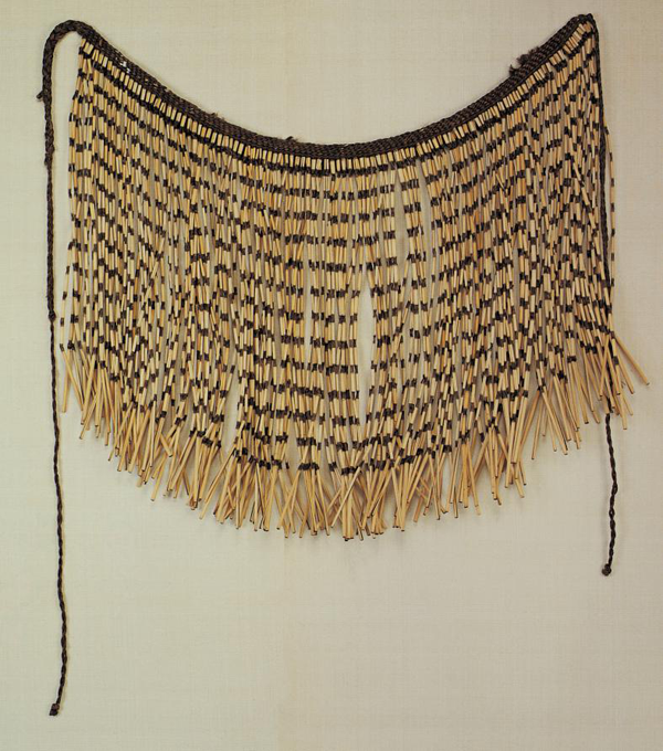 博嘎爾婦女穿一種叫“基都”的短上衣。用野麻織成的土布縫制,其樣式為無領(lǐng)、短袖、對(duì)襟。下部穿用羊毛織成的粗呢緊身筒裙,稱作“結(jié)邦”。小腿部扎裹腿,叫“涅蘇木”。條件好的人家外面還會(huì)罩一件稱為“階納布”的披肩。希蒙部落的婦女穿當(dāng)?shù)孛藁棾傻陌咨蛩{(lán)色的寬大對(duì)襟短上衣。下身穿筒裙,裙子下擺較寬,上面織有黃紅色或黃黑色的簡(jiǎn)單圖案(圖為民國(guó)時(shí)期的珞巴族草裙,中央民族大學(xué)民族博物館館藏)。