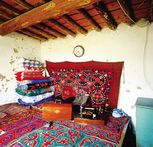 新疆維吾爾自治區(qū)木壘縣大南溝烏孜別克民族鄉(xiāng)鄉(xiāng)政府為烏孜別克牧民集中興建了定居房。新村街道整齊,土墻圍成的院落獨(dú)門獨(dú)院。院落很大,前院種菜栽樹,有水井,房后是牛欄羊圈。有的還單建了廂房作廚房。這里的住房都是長方形土坯平頂房,玻璃窗,墻壁很厚,冬暖夏涼。屋內(nèi)橫梁和走廊的木柱、木梁上有的是工筆重彩的花紋圖案,有的用雕花石膏鑲嵌或磚、木雕刻后鑲嵌,做工精細(xì)。墻壁上有整齊排列的拱形壁龕,里面擺著日用品和工藝品,四周也鑲嵌著花紋圖案。居民們住板炕,在屋里地上挖一小坑,坑內(nèi)放置火爐,鐵皮煙囪通向室外,坑上橫搭木板成板炕,板炕上鋪花氈坐毯??繅σ贿厰[著疊得整齊的被褥,繡花枕頭對稱地立在被褥上。墻上掛著壁毯,整個室內(nèi)既有局部美,又有整體美,賞心悅目。