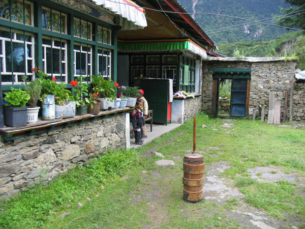 住宅一般是3層(也有4或5層的),向著陽(yáng)光,錯(cuò)落有致,庭院寬敞而大方,便于活動(dòng)和飼養(yǎng)家畜。房屋下層叫“薩容”,意為關(guān)牲畜的“圈”;上層叫做“徬”,用來(lái)存放青稞、蕎麥及其他雜物;中層叫作“米蘇麥”,是住人的居室,臥室內(nèi)多用木板相隔里外兩間,里間一般為倉(cāng)庫(kù),有門(mén)窗;外間面積很大,靠墻的中間臨近窗子下方,設(shè)有火塘,火塘是做飯、待客、聚會(huì)的核心場(chǎng)所,具有神圣地位。門(mén)一般朝東、南方向開(kāi),門(mén)前設(shè)有用木桿鋪搭的涼臺(tái),用石砌或木板做的階梯與樓下相通。房架為石木結(jié)構(gòu),梁、檁、椽之間搭接處均用竹篾條捆綁,很少用鐵釘。