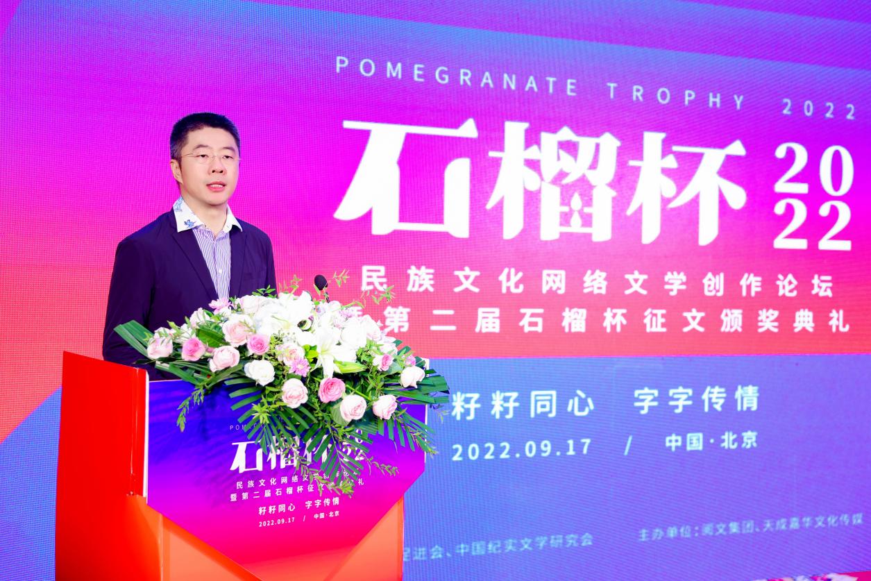 2022年9月17日,民族文化網(wǎng)絡(luò)文學(xué)創(chuàng)作論壇暨第二屆石榴杯征文頒獎(jiǎng)活動(dòng)在民族文化宮舉行。本次活動(dòng)得到了國家民委所屬中國少數(shù)民族文化藝術(shù)促進(jìn)會(huì)和中國紀(jì)實(shí)文學(xué)研究會(huì)的指導(dǎo)與支持,由閱文集團(tuán)、北京天成嘉華文化傳媒主辦,天成達(dá)星國際傳媒承辦。