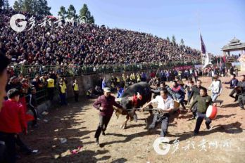 貴州省從江縣第十五屆原生態(tài)侗族大歌節(jié)的前一天,恰逢該縣逢亥斗牛日,丙妹鎮(zhèn)松學(xué)斗牛塘、谷坪鄉(xiāng)四寨河斗牛塘同時(shí)舉辦傳統(tǒng)牛王爭(zhēng)霸賽,喜迎一年一度“侗族大歌節(jié)”的到來,共有來自周邊村寨的80頭水牯牛參戰(zhàn),斗牛活動(dòng)場(chǎng)上名牛角逐,場(chǎng)面異彩紛呈,吸引數(shù)萬(wàn)名觀眾前來觀戰(zhàn)。