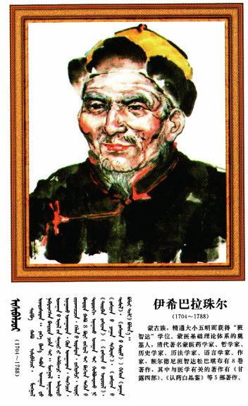 伊希巴拉珠爾(1704~1788),蒙古族,一名也協(xié)班覺、額爾德尼班智達(dá)·松巴堪布,蒙古衛(wèi)拉特人,著名蒙醫(yī)學(xué)家、文學(xué)家、天文學(xué)家哲學(xué)家。一生著作豐厚,其中對完善蒙醫(yī)理論體系有重要影響的著作有《甘露之泉》、《白露醫(yī)法從新》、《甘露點(diǎn)滴》、《甘露匯集》和《認(rèn)藥水晶鑒》,在這些著作中他將藏醫(yī)學(xué)理論與蒙古人的體質(zhì)、生活習(xí)俗、居住地區(qū)的地理、氣候條件等具體實(shí)際結(jié)合在一起,進(jìn)行創(chuàng)造性的理論研究,不僅豐富了臨床實(shí)踐的內(nèi)容,而且補(bǔ)充和完善了蒙醫(yī)學(xué)的理論體系,他將傳統(tǒng)蒙醫(yī)學(xué)“寒熱理論”與《四部醫(yī)典》中關(guān)于寒熱病理論的闡述進(jìn)行有機(jī)結(jié)合,使之成為近代蒙醫(yī)學(xué)病性辯證的總綱,同時(shí),他也闡述了將六基癥作為病因鑒別診斷的核心及其臨床表現(xiàn),使“六基癥”學(xué)說從理論到實(shí)踐都獲得了比較系統(tǒng)的發(fā)展。占布拉道爾吉是19世紀(jì)著名的蒙藥學(xué)家,他編著的《蒙藥正典》(又名嗚嗚蒙藥圖鑒)共收載蒙醫(yī)臨床常用藥物879種,按礦物、植物和動(dòng)物等分為8部24類,附插圖576幅,對每種藥物的產(chǎn)地、形態(tài)、性味、功能、入藥部分、采集加工、炮制方法、主治、用法等都闡述詳盡,并且每一味藥物都標(biāo)寫了蒙、藏、滿、漢四種文字的藥名,具有很高的參考價(jià)值。該書還附有外科術(shù)療器具圖解,以及放血穴位、針灸穴位、人體各部分劃分圖解說明等。敏如爾古布拉(1789-1838)編撰了蒙醫(yī)學(xué)方劑巨著《方?!?,是一部比較系統(tǒng)完整的蒙醫(yī)藥物方劑學(xué)經(jīng)典著作,收載方劑近200種,分為76章,進(jìn)行詳盡的論述和評(píng)點(diǎn),同時(shí)對相關(guān)疾病的病因、病機(jī)、分類和治法等也做了簡要論述。