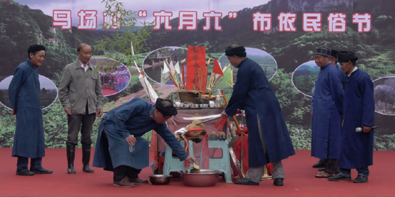 祭祀活動由寨老主持。牛頭、活雞等祭品供于案前,寨老穿著布依族的藍袍,誦頌著古老神秘的經(jīng)文,黝黑的臉上寫滿了對祖先、神靈的虔誠。而其他幾位德高望重的寨中老人,這時便協(xié)力殺了雞,人們用雞血淋紙旗插于火盆中,以火盆代替稻田,意為雄雞吃盡蝗蟲,糧食豐收,馬馱不盡。