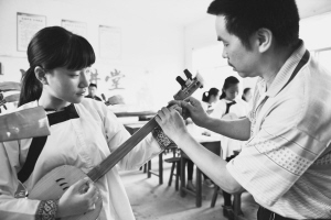 圖為一位音樂(lè)教師在指導(dǎo)學(xué)生調(diào)試侗族琵琶。 王炳真攝影報(bào)道