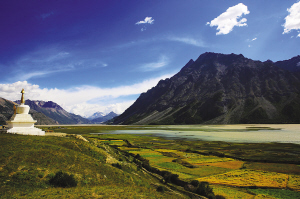 我們沿著湖畔徜徉,不經(jīng)意間步入了一片牧場,只見一群牦牛在吃草,遠(yuǎn)處的崗日嘎布雪山神奇而壯麗。雪山的冰雪融水構(gòu)成了然烏湖主要的補(bǔ)給水源,然烏湖向西蜿蜒十余千米逐漸收縮成一道河谷,旁邊有一處藏族的小村莊,美得好像世外桃源一般,這就是傳說中的瓦巴村。村民們依湖而居,湖邊的平地是他們的牧場和田埂。散落在這里的幾戶人家,屋旁都插著顏色各異的經(jīng)幡,隨風(fēng)陣陣擺動。