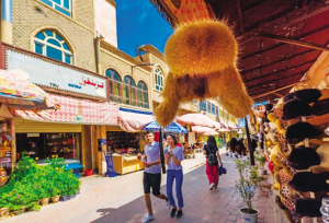 阿熱亞民俗文化街有多個巴扎,分別是首飾巴扎、花盆巴扎、坎土曼巴扎、木器巴扎、維藥巴扎、帽子巴扎。路上隨處可見妝扮時尚的當?shù)厍嗄辏⒆觽兇┲贫淳欧峙W醒潯?/span>