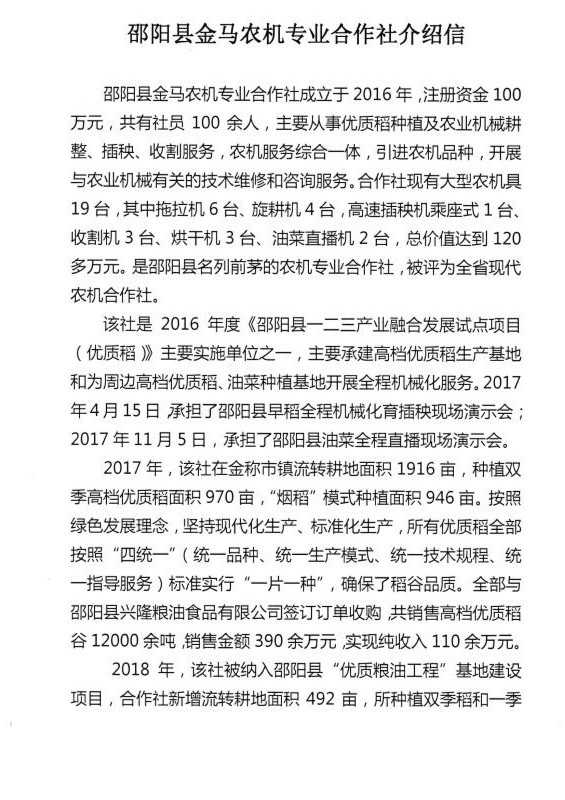 在農(nóng)機(jī)專(zhuān)業(yè)合作社的幫助下,當(dāng)?shù)剞r(nóng)業(yè)生產(chǎn)過(guò)程的機(jī)械化程度非常高。邵陽(yáng)縣金馬農(nóng)機(jī)專(zhuān)業(yè)合作社,位于邵陽(yáng)縣金稱(chēng)市鎮(zhèn)石馬村,主要提供組織農(nóng)業(yè)機(jī)械耕整、插秧、收割服務(wù),大大提高了當(dāng)?shù)氐姆N植和生產(chǎn)效率。