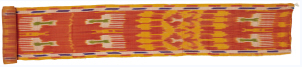 艾德萊斯綢收集于新疆庫爾勒地區(qū),大面積的紅色之中,點綴著象征維吾爾族生存環(huán)境的黃色,以及伊斯蘭教崇尚的綠色和象征著天空的藍色。木梳紋、石榴紋、龕座紋等紋樣呈條狀規(guī)則排列,多種色彩拼合出強烈的視覺效果,洋溢著跳蕩激昂的韻律和熱情似火的西域風情。