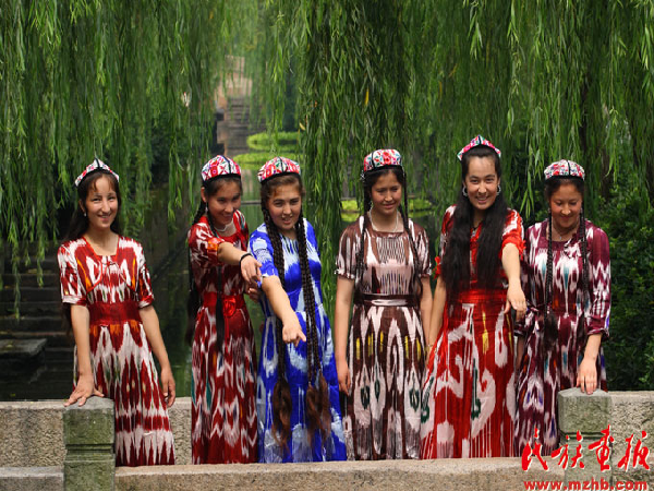 如果說苗族服飾是苗族的一部“無字史書”的話,那新疆維吾爾族的艾德萊斯綢和小花帽則是維吾爾族熱情奔放性格的集中體現(xiàn)。艾德萊斯綢質(zhì)地柔軟,輕盈飄逸,非常適合縫制夏裝。按顏色分為黑艾德萊斯、紅艾德萊斯、黃艾德萊斯和多色艾德萊斯。紅艾德萊斯綢圖案為紅色,底色用黃色或白色,富于青春氣息,深受姑娘和少婦的喜愛。黃艾德萊斯綢圖案為黃色,在各種底色的襯托下顯得莊重而典雅,顯示一種富貴氣息,一般在制成中青年婦女服裝的時候使用。綠艾德萊斯綢多用來縫制學齡前兒童的女裝。維吾爾族無論男女老幼,不分春夏秋冬,都喜歡戴一種維吾爾族語稱為“朵巴”的小花帽,制作小花帽運用絲線平繡、絲線結(jié)繡、串珠片繡、格子架繡、盤金銀繡、十字花繡、鉤花刺繡、扎絨刺繡以及刺、扎、串、盤等技法,將花卉果實等圖案匯集在帽子中,使小花帽的顏色豐富多彩。
