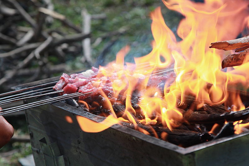 負責燒烤者將串好的肉串在水里蘸一下,再往長形的白鐵皮烤串爐上一放,“刺啦刺啦”的油脂滴在炭火上,白氣與火苗齊竄,再往肉串上灑孜然、辣椒、鹽,一股藍色的香氣噴涌而出,撩撥著人們的味蕾。烤肉者兩手交替翻轉,依經驗把握時間及火候,出爐前再均勻灑上一遍調料,這一大把烤肉就出爐了。