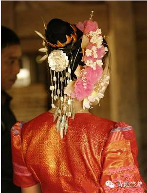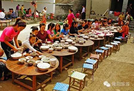 男方家也得請客。新郎啟程去接新娘子,家里馬上就殺雞做飯,新郎新娘回來后要吃染成黃色的糯米飯和雞肉,表示往后生活美滿幸福,像糯米飯一樣結(jié)成團(tuán)永不分開。晌午時(shí)分,是新郎家待客最熱鬧的時(shí)候,幫廚的人擺上各種酒菜,親朋寨鄰老老少少全坐到天井里,歡歡鬧鬧地吃飯。最后,客人們有的陸續(xù)走了,愿留下的湊攏幾桌,邊喝酒邊暢談,一直要吃到第二日還不歇。