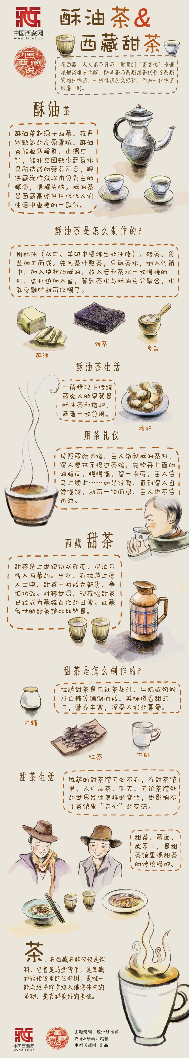 西藏人的飲料以茶為主,喝茶是藏族、門巴族、珞巴族日常生活中不可缺少的一部分。生活在西藏高原上的人一般早上都要喝茶,最喜歡喝的是酥油茶,還有奶茶和清茶。打酥油茶之前先將磚茶或[刪]熬成汁,濾出茶葉,將茶汁倒入專用陶罐內(nèi)盛放,隨用隨取。打酥油茶時(shí),先從存放茶汁的陶罐內(nèi)取出適量的茶汁,加上適量的開水和食鹽,倒人酥油茶桶內(nèi),放上酥油,上下抽動(dòng)酥油茶桶內(nèi)的攪桿幾十下,使酥油與茶水充分交融,倒出來便是香噴噴的酥油茶了。女主人把打好的酥油茶盛在陶質(zhì)酥油茶壺內(nèi),將壺坐在陶質(zhì)羊糞火爐上保溫,現(xiàn)飲現(xiàn)倒,始終是熱的。因?yàn)榇蚝玫乃钟筒枰3趾銣兀炔荒軣_,也不能讓其涼了。若再燒開,茶就變味不好喝;若放涼了,則茶里的酥油趨于凝固不好喝。羊糞火爐里的羊糞[刪]火是暗火,能使壺里的茶既不開也不涼。非常適合藏家人的這一生活需求。西藏一年到頭氣候干燥,生活在這里的人一天到晚離不開茶,一般早茶必須是酥油茶,中午以后則喝不加酥油或牛奶的清茶。