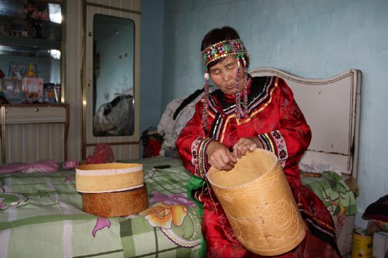 鄂倫春族素有“白樺民族”之稱,白樺樹皮制品種類非常多,大到可以乘人載物的樺皮船、圍蓋“仙人柱”的“鐵克沙”,小到可以裝在衣兜里的煙盒和含在口中的狍哨,提水用的桶、采集用的簍、裝物用的箱、盛飯用的盆、吃飯用的碗、喝酒用的蠱等等。樺樹皮制品的裝飾圖案可以通過壓劃、壓?。c刺)、剔刻、烙燙、補花、繪畫等多種方法形成。壓印點刺是最常用的裝飾手段,工具是用獸骨制成的,分單齒、雙齒、多齒和簡單幾何形幾種。先在剪裁好的器物材料上,用壓、打等方法點刺出裝飾紋樣,再縫合成器物成品。這種裝飾多為素面凹形花紋,顯得樸實單純,而且器物越陳舊樺皮顏色越深,越有光澤,圖紋越清晰。也有人在壓打線上著色,這便形成了另一種風格,美觀艷麗而且突出了物象特征。