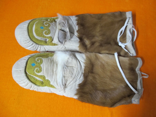 此外鄂倫春人還有被稱為“瓦拉開依”的手套,它和北方人做的棉手悶子一樣,是拇指同其他四指分開的手套,手心處無開口,戴這種手套可以保暖,也可以拿比較笨重粗大的東西,但不能射獵。另一種被稱為“沙拉耶開依”,是五指手套,即五指分開,戴這種手套拿東西或射擊都很方便,但保暖性能差,多為青年人喜愛和佩戴。鄂倫春人冬季出獵,一般還是喜歡戴“考胡魯”。以上三種手套多用狍皮制作,五指分開的手套也有用鹿皮制作的。