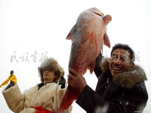 “祭湖”結(jié)束后, “魚把頭”帶領(lǐng)幾位漁工在剛才祭湖的冰面上,用冰镩鑿開一個(gè)1米左右的冰洞,“魚把頭”拿著抄撈子,在冰洞里攪和幾下,使勁往上一揚(yáng),只見一條活蹦亂跳的胖頭魚就被 撈出水面。經(jīng)過磅秤,重32斤,稱為“開湖頭魚”。經(jīng)過幾輪叫賣,這條“頭魚”以人 民幣8888元的價(jià)格被一位廣東來的游客買走。