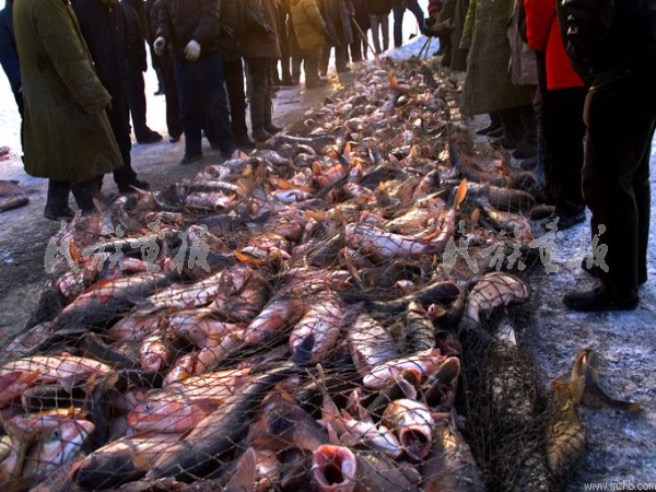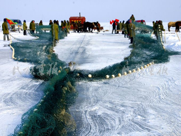 隨著“魚把頭”高亢的號(hào)子,馬拉人拽,一張幾千米長的大網(wǎng),被緩緩地拉出冰面。鯉魚、鯽魚、鰱魚、鯰魚等各種魚類一群一群翻上了冰眼。轉(zhuǎn)眼之間,冰面上堆起了一個(gè)個(gè)魚垛。