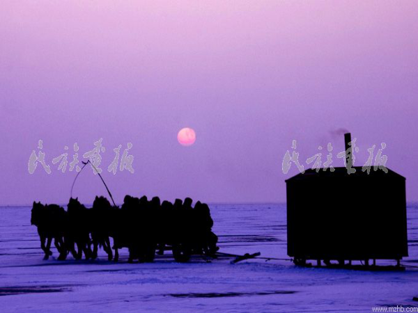 不知不覺,夕陽垂近在遠(yuǎn)處的冰面,夜幕降臨了。游客、魚販、漁工跟著運(yùn)魚的馬爬犁漸漸離去。迎著晚霞,我們也戀戀不舍地離開了查干湖……
