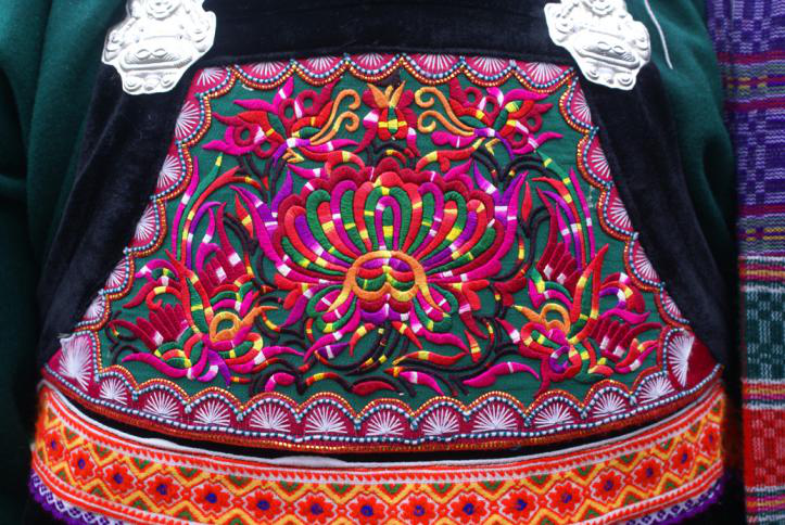 水族有養(yǎng)馬賽馬習(xí)俗,馬尾繡應(yīng)運(yùn)而生。以絲線裹馬尾刺繡制作圖案的好處是馬尾質(zhì)地較硬,能使圖案不易變形,馬尾不易腐敗變質(zhì),經(jīng)久耐用;還有馬尾上含有油脂成分,利于保養(yǎng)外圍絲線光澤;另一奇特之處就是繡品上綴有形如古代錢幣的銅飾,以紅線穿貼于馬尾繡片里,如星星點(diǎn)點(diǎn)的小花,除了做裝飾外,水族同胞認(rèn)為,銅有驅(qū)邪避兇的功能。在封建社會,銅是鑄幣之物,一些朝代嚴(yán)禁民間鑄銅,馬尾繡里卻繡有銅飾,這充分體現(xiàn)了水族馬尾繡的珍貴文化藝術(shù)價(jià)值。