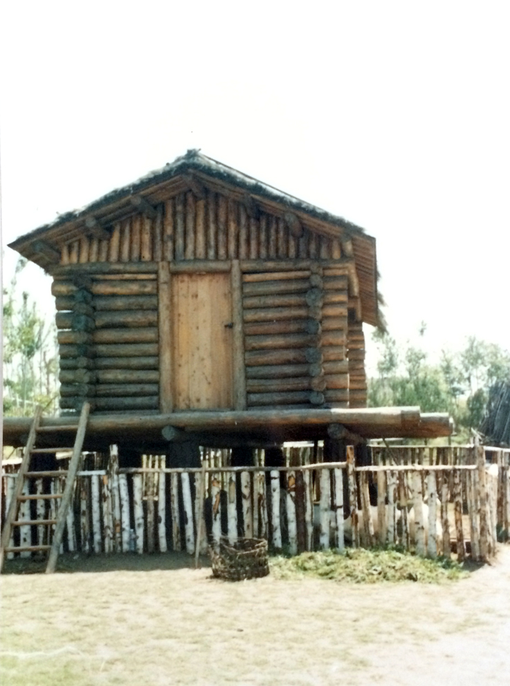 早期,每一個(gè)家族公社都有一個(gè)公用的高腳倉庫,鄂倫春語叫“歐倫”,一般是在游獵的中心地帶,選擇四棵自然生長(zhǎng)、成對(duì)角的樹,在距地面約3—4米高的地方留一個(gè)樹杈,砍掉其余的樹頭,樹杈上架兩根直樹干,樹干上面一根挨一根地平鋪木桿成為底座,底座上用木桿壘一個(gè)“木刻楞”小房或用樹枝做一個(gè)半圓形的架子,覆蓋樺樹皮,然后用藤條或樹皮綁縛固定。一側(cè)留有進(jìn)出的小門,借助木梯上下,為防止野獸攀上糟蹋東西,平時(shí)都把木梯放倒在一邊。這種倉庫主要存放一些暫時(shí)吃不了和用不著的食品和雜物,搬遷時(shí)不拆除,里面的東西也不帶走,什么時(shí)候需要再騎馬來取。個(gè)體小家庭獨(dú)立以后,公共庫房變成了私家財(cái)產(chǎn)。雖說是私家財(cái)產(chǎn),卻從不留人看守,也不上鎖。獵人在外打獵,如果一時(shí)斷糧,可以不經(jīng)主人允許,隨便到任何一家的“歐倫”中拿走所需要的東西,事后向主人通告一聲即可,以后有了如數(shù)奉還,不還主人也不索要。