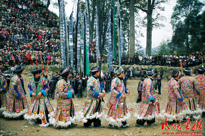 苗族春節(jié)是以農(nóng)歷正月初一為歲首的漢族和其他少數(shù)民族共同歡度的傳統(tǒng)節(jié)日。在黔東南的苗族,把春節(jié)叫做“漢年”(niangxdiel)與傳統(tǒng)的“苗年”(niangxhmub)并存,和其他民族一共同歡度,尤其是那些不過(guò)苗年的苗族地區(qū),主要是過(guò)春節(jié),但不及苗族過(guò)苗年隆重,識(shí)漢字的苗族也貼些對(duì)聯(lián)、門神之類,其余與過(guò)苗年相同,即增加了斗牛、賽馬、走親訪友以及男女青年“游方”、對(duì)歌等民族特色的內(nèi)容。有的人家的男婚女嫁也選在春節(jié)舉行。湘西地區(qū)的苗族過(guò)春節(jié),還舉行規(guī)模盛大的“趕牛場(chǎng)”活動(dòng);廣西融水縣一帶的苗族過(guò)春節(jié),舉行蘆笙舞會(huì),每年群眾竟達(dá)數(shù)萬(wàn)人之多。