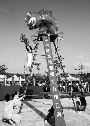 舞獅者可以攀上20多張高凳疊成的“金山”頂上施展雄姿,可以在懸空的鋼絲繩上如履平地般跳躍翻騰,可以在閃閃發(fā)光的刀山頂上表演堪稱(chēng)“世界一絕”的刀尖頂肚旋轉(zhuǎn)。