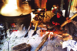 二層為生活起居場(chǎng)所。壯家人的火塘,是一家人炊煮就餐、烤火取暖之處?,F(xiàn)在即使用上了沼氣和電器的家庭也離不開(kāi)火塘