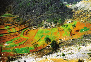 廣西百色地區(qū)那坡縣村落。村寨多隨地形與山勢(shì),布局自由分散,既不存在縱橫軸線,也沒(méi)有明顯的村寨邊界。受地形影響,村寨規(guī)模一般不大